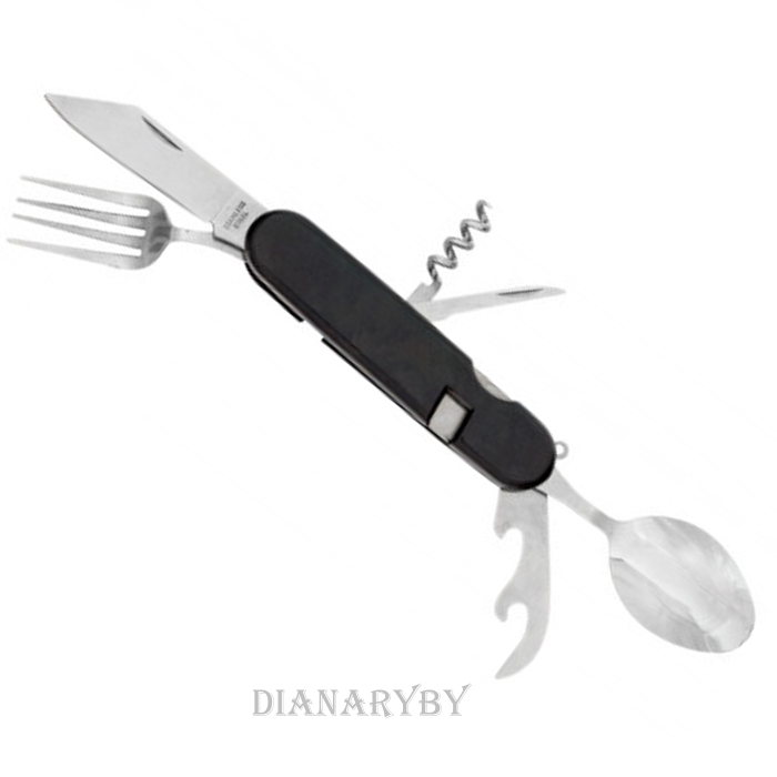 Multifunkčný vreckový nožík vhodný na turistiku, kemping či rybolov. V jednom nástroji nájdete nôž, lyžičku, vidličku, otvárač na konzervy a vývrtku